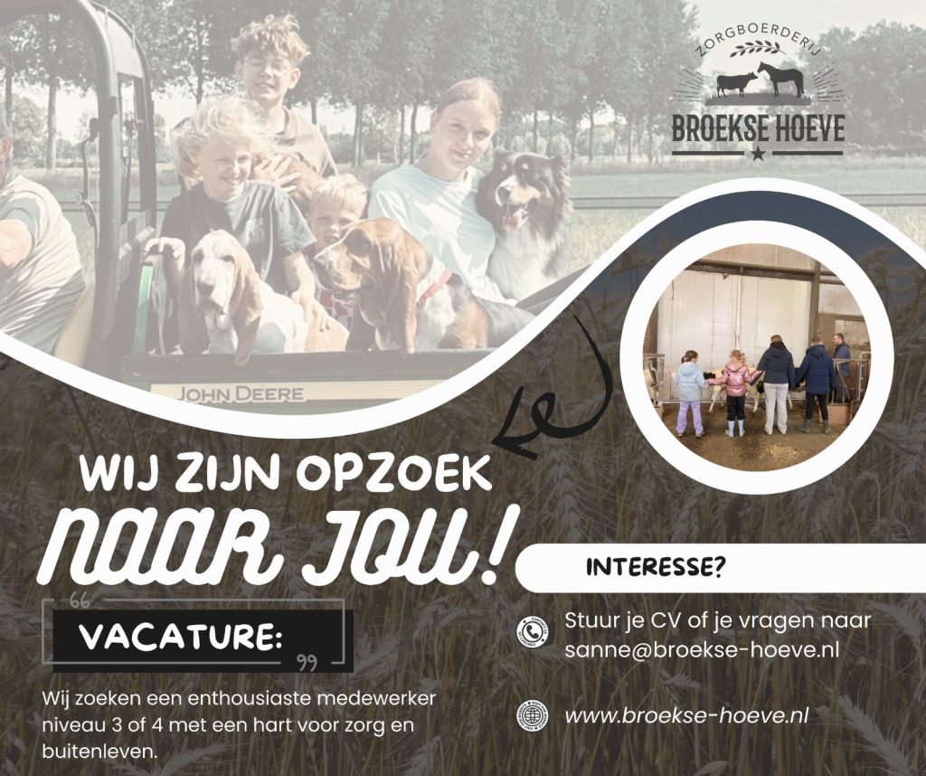 Stuur je motivatie en CV naar ons toe en wie weet verwelkomen we jou binnenkort op De Broekse Hoeve.